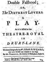 1727年12月13日,劉易斯·西奧博爾德版的《雙重背叛》[Double Falsehood,又名《苦惱的情人》(The Distrest Lovers)]在德魯里巷的皇家劇院上演,沉寂已久的《卡丹紐》終于再度浮出水面。西奧博爾德宣稱自己擁有該作的手稿,但1728年印刷出版的《雙重背叛》卻似乎是經(jīng)過大量編輯和改寫的。