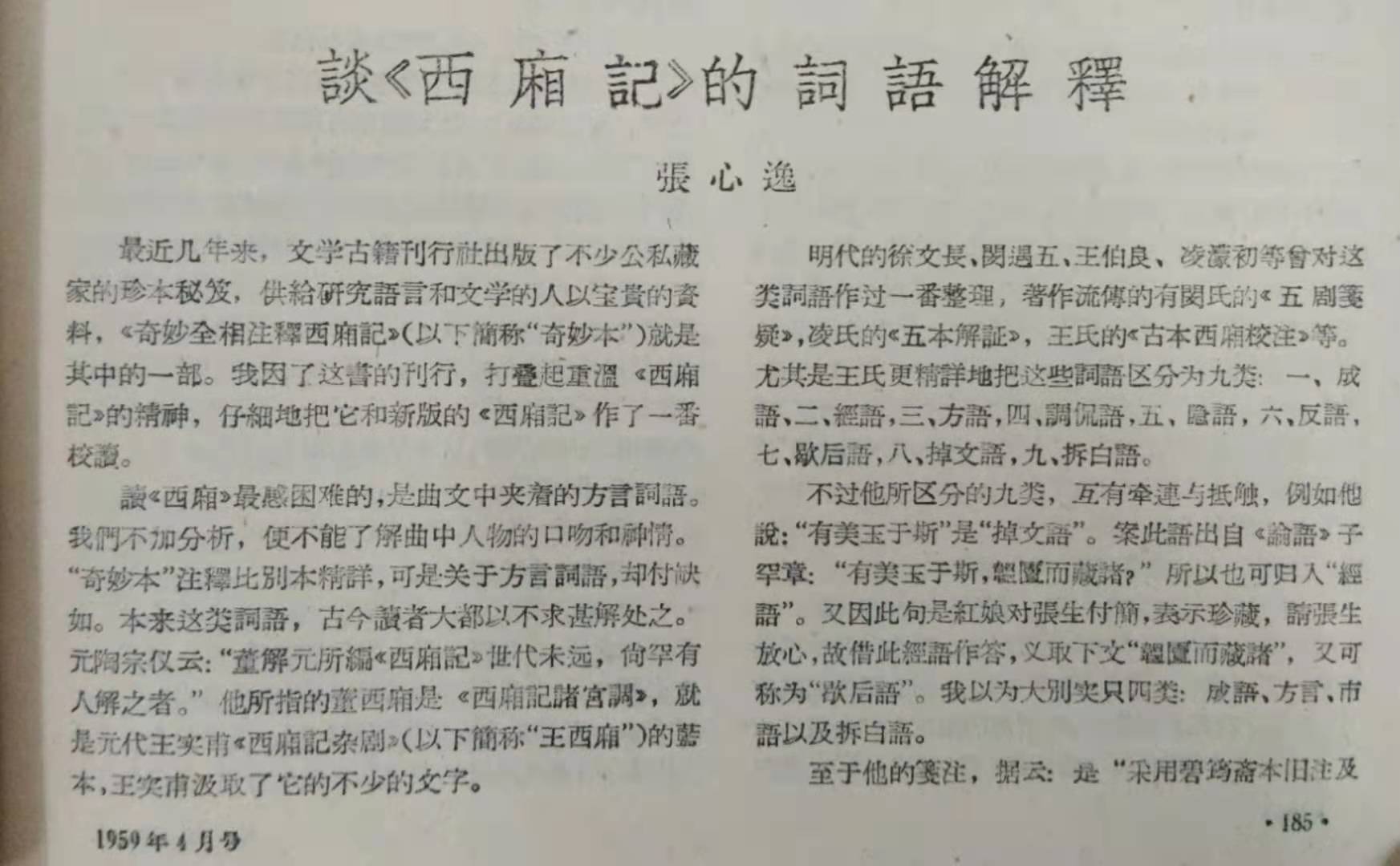 除了深入研討《劉知遠諸宮調(diào)》,在此前后短短數(shù)年間,張心逸還另發(fā)表了《談〈西廂記〉的詞語解釋》(載《中國語文》1959年第4期)、《古劇詞匯答問》(載《文匯報》1961年10月18日)、《新發(fā)現(xiàn)的〈明何璧校本北西廂記〉》(載《江海學(xué)刊》1961年12月)以及《〈元曲選釋〉補證》(連載于1959年至1962年《橫濱市立大學(xué)論叢》)等多篇論文,以語詞的考索釋證為主,兼及版本的調(diào)查勘驗,同樣得到不少同行專家的褒揚稱引。