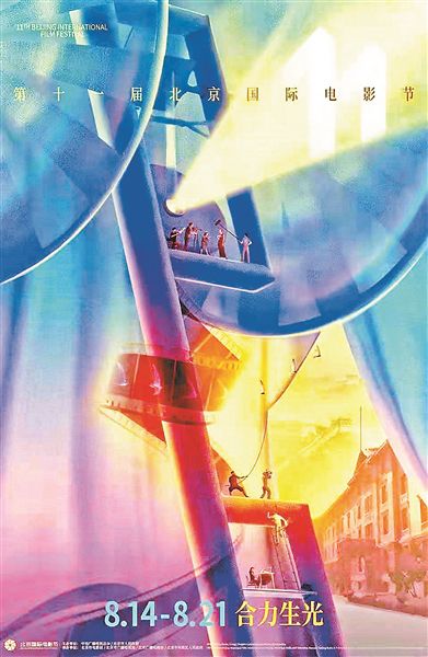 本屆電影節(jié)海報主題命名為“合力生光”,設(shè)計(jì)主體沿用了上一屆海報的核心元素——風(fēng)車放映機(jī)。葉片轉(zhuǎn)動,燈光亮起,眼前的大幕正在徐徐拉開。風(fēng)車之上,一隊(duì)電影工作者正在那里工作,導(dǎo)演、攝像、燈光、錄音、場記、化妝……而拉開的大幕后浮現(xiàn)出的是長城、北大紅樓和盤旋天上的北京雨燕。