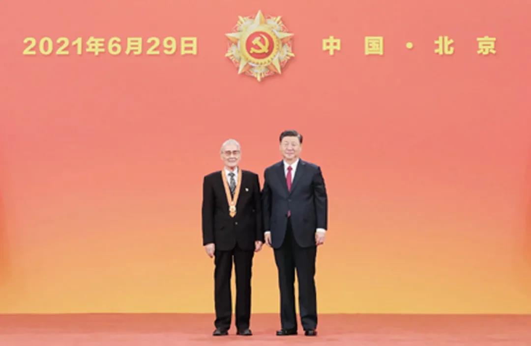 6月29日,慶祝中國共產(chǎn)黨成立100周年“七一勛章”頒授儀式在北京人民大會(huì)堂金色大廳隆重舉行。中共中央總書記、國家主席、中央軍委主席習(xí)近平向“七一勛章”獲得者藍(lán)天野頒授勛章。新華社記者 李學(xué)仁 攝