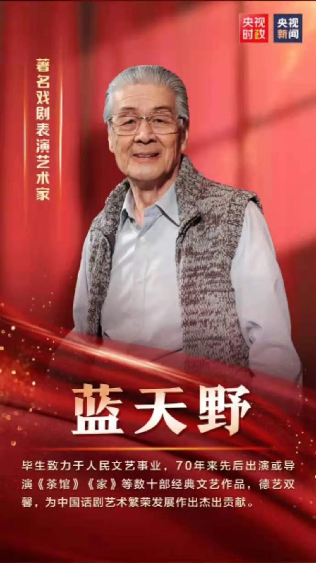 6月29日,慶祝中國共產(chǎn)黨成立100周年“七一勛章”頒授儀式在北京人民大會(huì)堂隆重舉行,94歲的藍(lán)天野獲頒“七一勛章”。70年來,藍(lán)天野出演及導(dǎo)演了大量文藝作品。尤其是在北京人藝那些具有民族化、寫意化風(fēng)格的古裝劇中,他的表演有著十分獨(dú)特的韻味。他在話劇及電影《茶館》中飾演的秦仲義、話劇《蔡文姬》中飾演的董祀、話劇《王昭君》中飾演的呼韓邪等人物,成為其他演員迄今難以超越的形象。他在電視劇《渴望》和《封神榜》中飾演的王子濤和姜子牙的熒幕形象在觀眾中更是膾炙人口。繼2011年84歲高齡重返北京人藝舞臺(tái),演出經(jīng)典劇目《家》之后,2012年,北京人藝建院60周年,藍(lán)天野出演了原創(chuàng)大戲《甲子園》中的男一號(hào)黃仿吾,與諸多人藝高齡老藝術(shù)家一起創(chuàng)造了中國話劇史上的又一奇跡。2018年,藍(lán)天野為北京人藝執(zhí)導(dǎo)了新創(chuàng)話劇《大訟師》,2020年,93歲的藍(lán)天野在北京人藝68周年院慶晚會(huì)上的《蔡文姬》片段中再度飾演了董祀一角,成為話劇舞臺(tái)上的一段佳話。