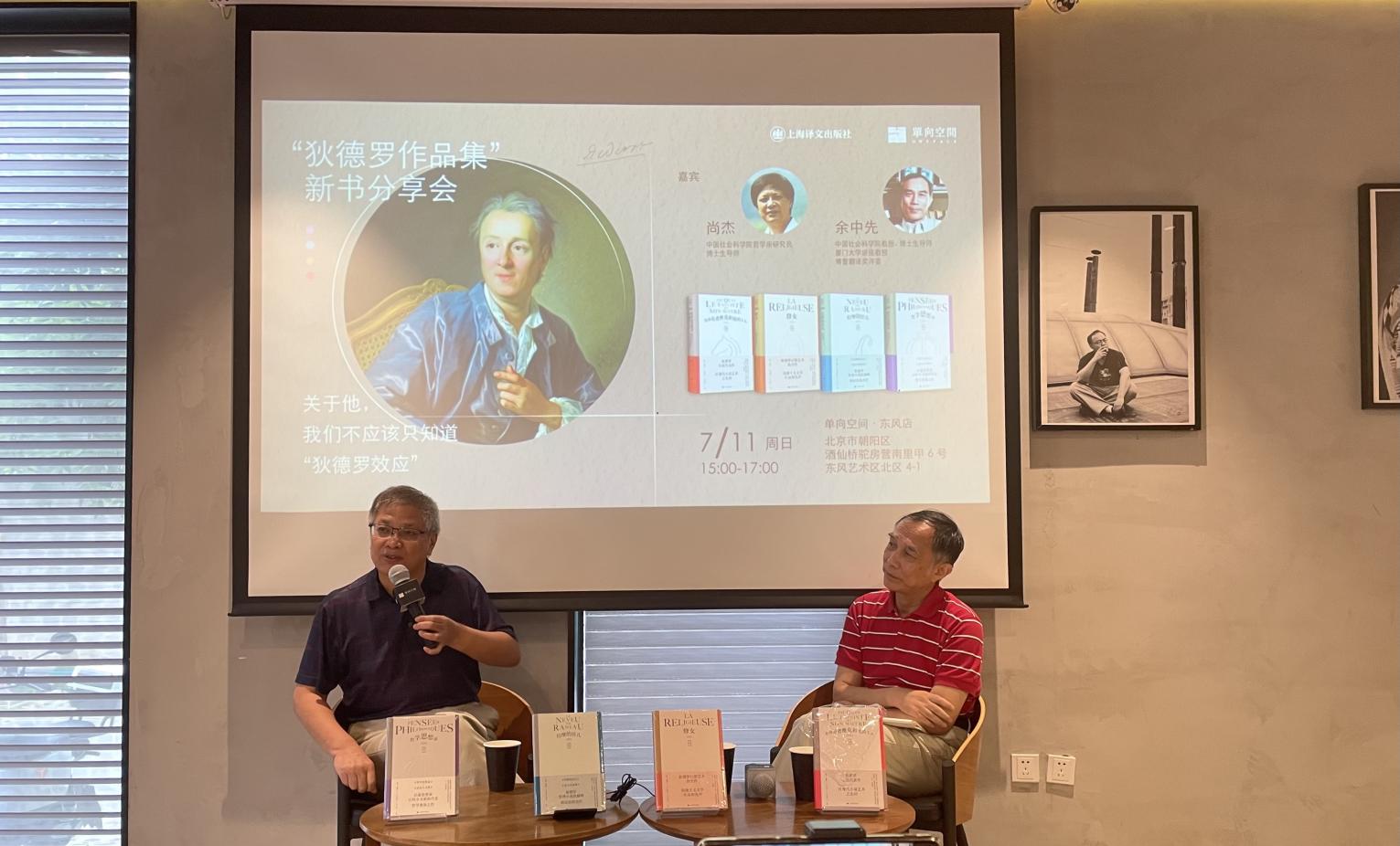 7月11日下午,上海譯文出版社在北京單向空間東風(fēng)店舉辦以“關(guān)于狄德羅,我們不應(yīng)該只知道狄德羅效應(yīng)”為主題的新書分享會,中國社會科學(xué)院哲學(xué)所研究員尚杰和法語文學(xué)翻譯家余中先共同講述狄德羅在文學(xué)和思想等方面的貢獻(xiàn)。分享會由上海譯文出版社狄德羅作品集策劃編輯李月敏主持。
