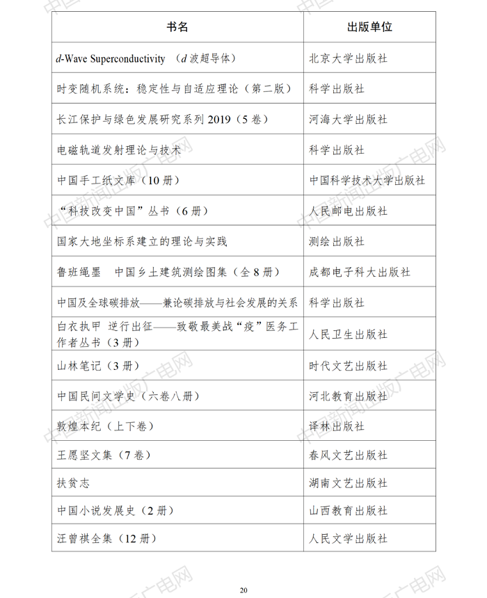 為深入學(xué)習(xí)宣傳貫徹習(xí)近平新時(shí)代中國(guó)特色社會(huì)主義思想,全面落實(shí)黨的十九大和十九屆二中、三中、四中、五中全會(huì)精神,促進(jìn)出版業(yè)高質(zhì)量發(fā)展,推進(jìn)社會(huì)主義文化強(qiáng)國(guó)建設(shè),根據(jù)《中國(guó)出版政府獎(jiǎng)評(píng)獎(jiǎng)?wù)鲁獭芬?guī)定,國(guó)家新聞出版署組織開(kāi)展第五屆中國(guó)出版政府獎(jiǎng)評(píng)選表彰活動(dòng)。經(jīng)嚴(yán)格評(píng)選,《習(xí)近平談治國(guó)理政》(第一、二、三卷)等3種圖書(shū)獲榮譽(yù)獎(jiǎng),《習(xí)近平新時(shí)代中國(guó)特色社會(huì)主義思想學(xué)習(xí)綱要》等60種圖書(shū)獲圖書(shū)獎(jiǎng),《中共黨史研究》等20種期刊獲期刊獎(jiǎng),《我們走在大路上》等20種作品獲音像制品、電子出版物和網(wǎng)絡(luò)出版物獎(jiǎng),《慶祝中華人民共和國(guó)成立70周年盛典圖冊(cè)》等10種作品獲印刷復(fù)制獎(jiǎng),《嘉卉——百年中國(guó)植物科學(xué)畫》等10種作品獲裝幀設(shè)計(jì)獎(jiǎng);人民出版社等50家單位獲先進(jìn)出版單位獎(jiǎng);高克勤等69名個(gè)人獲優(yōu)秀出版人物獎(jiǎng)。此外,237種優(yōu)秀出版物獲提名獎(jiǎng)。