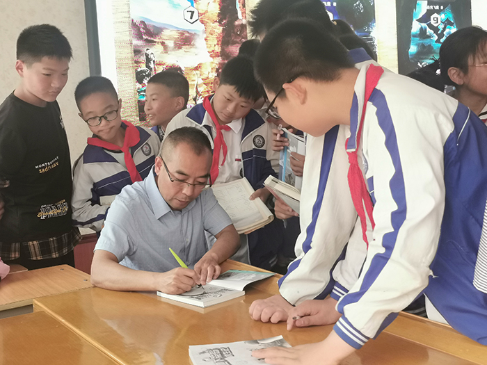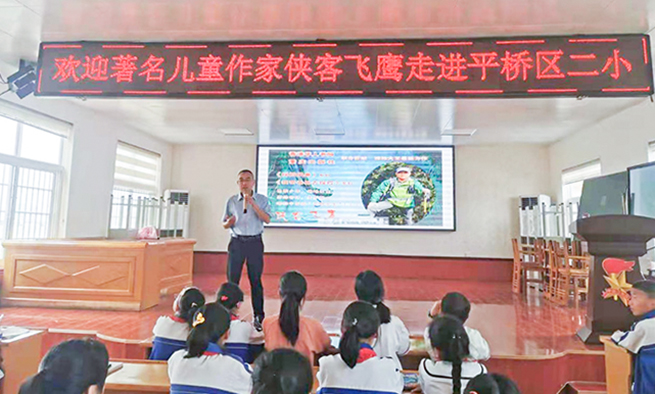 近日,在信陽市文藝志愿者協(xié)會成立大會結(jié)束后,河南省信陽市作協(xié)、市書協(xié)、市攝協(xié)、市美協(xié)立即響應(yīng)號召,行動起來,組織文學(xué)藝術(shù)家入校園、下基層,進(jìn)鄉(xiāng)村開展文藝志愿者在行動主題活動。信陽市文學(xué)志愿者、市作協(xié)副主席、兒童文學(xué)作家俠客飛鷹(陳春仁)走進(jìn)平橋區(qū)第二小學(xué)多媒體廳,為五年級階段100多名學(xué)生講授“如何寫好一篇游記作文”主題講座。