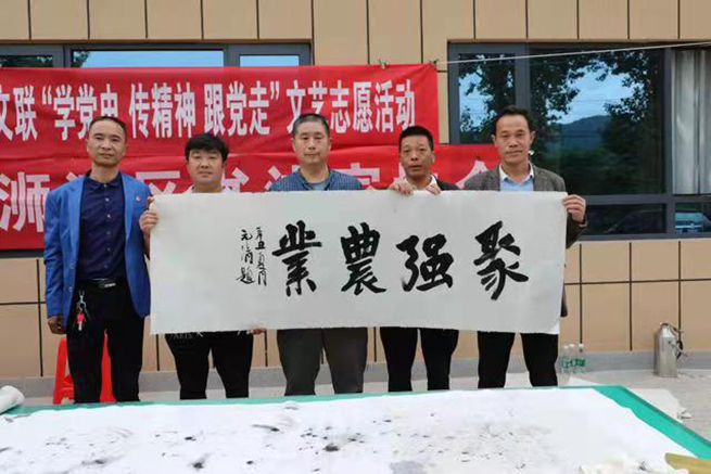 在浉河區(qū)譚家河鄉(xiāng)靈官村,市書協(xié)、美協(xié)和攝協(xié)的藝術(shù)家們齊聚一堂,積極參加由浉河區(qū)文聯(lián)主辦的文藝志愿者在行動主題活動。書畫家們自帶筆墨紙硯,揮毫潑墨,向群眾展示了書畫藝術(shù)的魅力,親手為基層群眾送去現(xiàn)場創(chuàng)作的書畫作品。