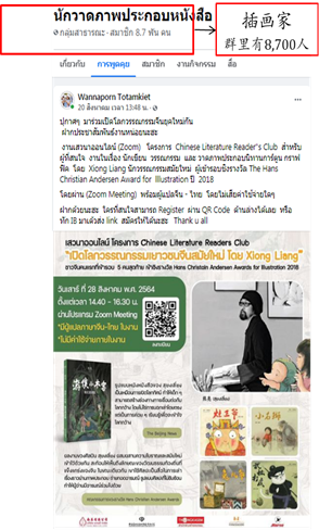 活動進(jìn)行過程中,在線讀者紛紛留言,對熊亮的作品給予了高度評價,并希望熊亮的作品可以走進(jìn)泰國,讓泰國讀者切身感受其中的神秘世界,促進(jìn)中國童書走進(jìn)海外市場?;顒右驳玫搅颂﹪妒澜缛請蟆贰秮喼奕請蟆返戎匾埫降臓幭鄨蟮?。同時,在Facebook等社交平臺上設(shè)立了多個粉絲群組,粉絲高達(dá)8600人。