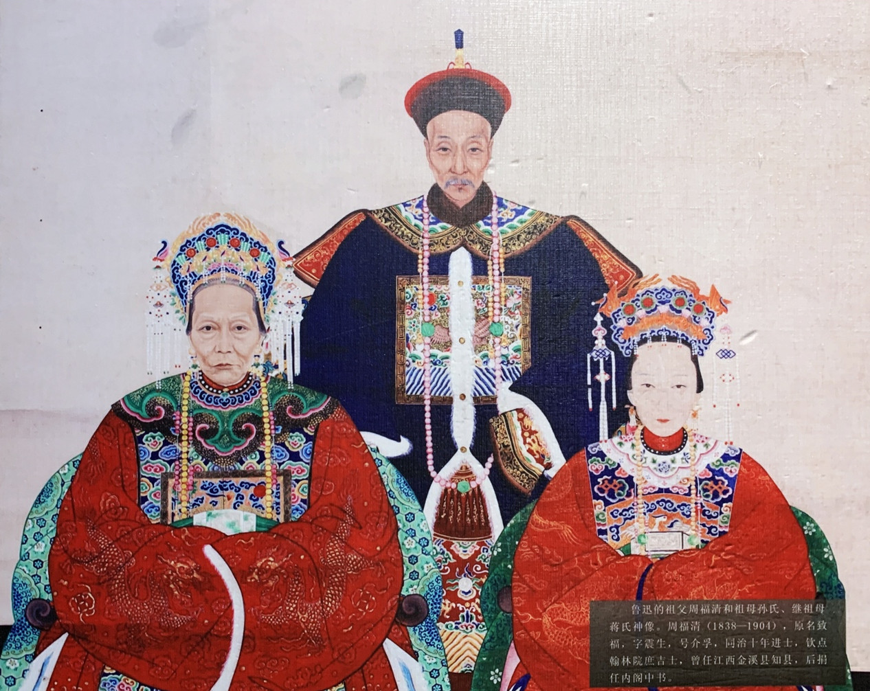 魯迅的祖父周福清(字介孚,1838-1904),同治十年進(jìn)士,欽點(diǎn)翰林院庶吉士,曾任江西金溪縣知縣,后捐任內(nèi)閣中書(shū)。后因科場(chǎng)案入獄。圖為紹興魯迅故居內(nèi)魯迅祖父周福清和祖母孫氏、繼祖母蔣氏的畫(huà)像。