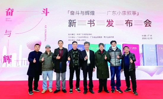 2020年12月15日,由中共廣東省委宣傳部指導(dǎo),廣東省作協(xié)、廣東省出版集團(tuán)聯(lián)合主辦的重大主題創(chuàng)作《奮斗與輝煌——廣東小康敘事》新書發(fā)布會在廣州舉行。圖為該書部分作者合影