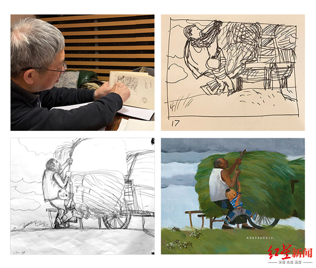 朱成梁提出了許多需要確認(rèn)的問(wèn)題:故事發(fā)生的時(shí)節(jié)?房子是什么樣式?院子里都有什么?旁邊有沒(méi)有菜地或農(nóng)田?里面都種了些什么?爺爺?shù)氖滞栖?chē)是什么樣式?用什么樣的繩子去捆草?草是什么樣的?大河有多寬?河堤是什么樣子的?
