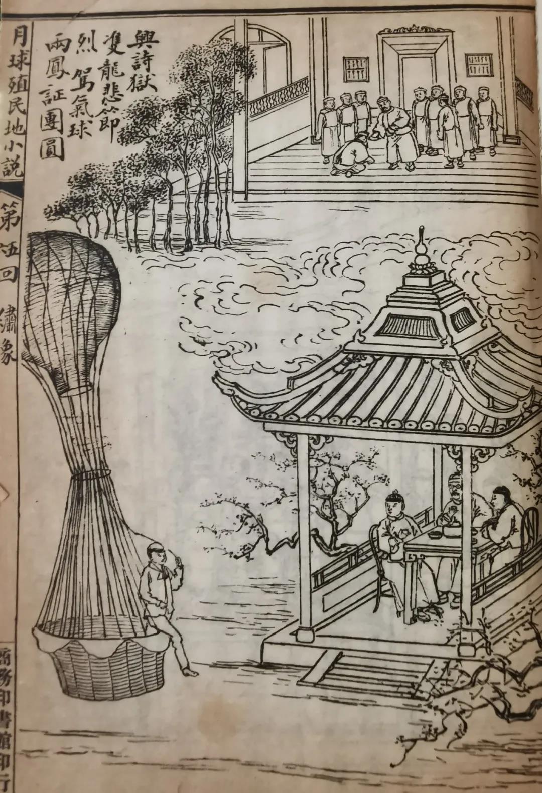 這種無(wú)心插柳而來(lái)的時(shí)空異常并非特例。在被后世追認(rèn)為“中國(guó)作者創(chuàng)作的最早的科幻小說(shuō)”《月球殖民地小說(shuō)》(1904)中,主人公乘坐著極其先進(jìn)的氣球在世界各地漫游,渴望飛向月球。氣球首次登場(chǎng)時(shí),亦有一處被人忽視的細(xì)節(jié):“卻好在亭子面前一塊三五畝大的草地落下”??磥?lái),氣球的底面積還比不上一個(gè)現(xiàn)代標(biāo)準(zhǔn)操場(chǎng)大,然而,作者“荒江釣叟”(真實(shí)身份待考)卻將臥室、客廳、體操場(chǎng)、大餐間、兵器房等等一并塞入其中,打造了一個(gè)無(wú)所不備的豪華空中行宮。如此信手寫來(lái)固然毫不費(fèi)力,卻難住了當(dāng)時(shí)的畫師,于是讀者在插圖中只能瞧見(jiàn)一個(gè)平常的熱氣球吊著一個(gè)小竹筐,內(nèi)中的瑰奇炫目,全靠自己腦補(bǔ)。