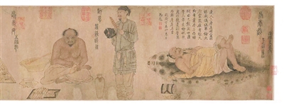 宋人《會昌九老圖》為絹本設色,由于年代久遠及保存條件欠佳,整卷作品比較暗淡,但仍不失為一件珍貴的宋代人物作品。畫題取自《新唐書·白居易傳》,講述了詩人白居易因直言朝政,被權貴所忌,遂棄官歸隱香山(今河南洛陽附近)。他自稱香山居士,曾于唐會昌五年(845)在家中與年高而不慕名利的胡杲、劉真、盧真、張渾等結成“九老會”,并請畫師繪圖紀念。畫中各段聚會場景被畫家通過庭園中的水榭、方亭、池岸、艤舟巧妙連接在一起,形成了類似電影鏡頭般的畫面。透過略顯“醬色”的絹本,觀眾可見老人們聽琴、弈棋、吟詩、觀畫等娛樂場景,表現(xiàn)了他們自甘淡泊、與世無爭的精神世界。