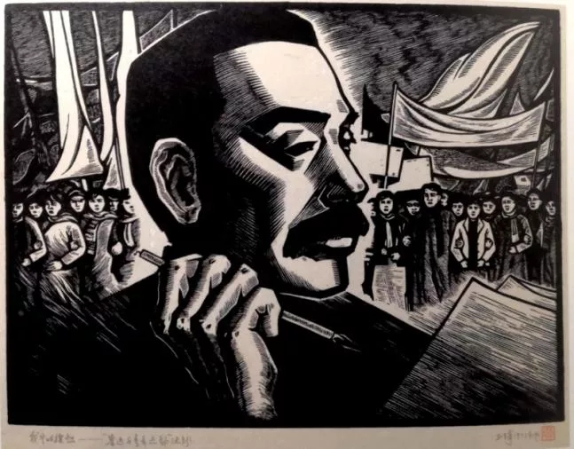 圖6 戰(zhàn)斗的旗幟——魯迅與青年運(yùn)動(dòng) 王琦 1973年 木刻