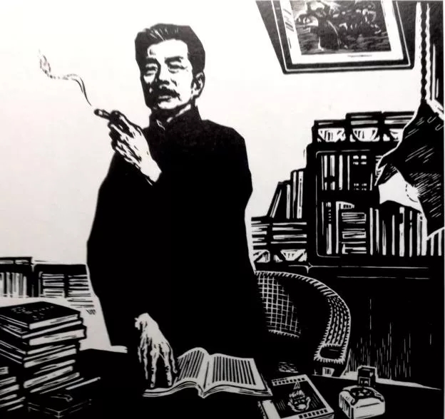 而魯迅則毋庸置疑地被樹(shù)立為了自我改造的榜樣。1951年魯迅逝世十五周年紀(jì)念日時(shí),《人民日?qǐng)?bào)》發(fā)表社論《學(xué)習(xí)魯迅,堅(jiān)持思想斗爭(zhēng)!》指出:“當(dāng)魯迅先生僅僅是一個(gè)進(jìn)化論者的時(shí)候,他的勇敢曾經(jīng)有時(shí)候伴著對(duì)于前途的迷惑。但在接受了馬克思列寧主義的真理以后,他就成了堅(jiān)決的徹底的毫不懷疑的思想的戰(zhàn)士了?!盵10]知識(shí)分子的自我改造由此成為魯迅逝世紀(jì)念活動(dòng)的題中之義。既然魯迅的自我改造是在馬列主義的指導(dǎo)下實(shí)現(xiàn)的,那么在美術(shù)家的筆下,魯迅作為自我改造模范的形象一定和馬列主義有密切的關(guān)聯(lián)?!墩J(rèn)真學(xué)習(xí)馬列著作》(圖7)這幅油畫(huà)描繪的即是魯迅學(xué)習(xí)馬列著作的情景,畫(huà)面中魯迅劃燃火柴準(zhǔn)備點(diǎn)煙,火柴已經(jīng)燒完了半截,然而魯迅的目光卻依舊被桌子上攤開(kāi)的書(shū)所吸引,遲遲不能移開(kāi)。這個(gè)瞬間極為生動(dòng)地表現(xiàn)出魯迅學(xué)習(xí)馬列著作的認(rèn)真和投入。進(jìn)一步地,能讓煙不離手的魯迅“廢煙忘點(diǎn)”的馬列著作,無(wú)疑具有巨大的價(jià)值和魅力,對(duì)魯迅產(chǎn)生著深刻的影響。李以泰的木刻《馬克思主義是最明快的哲學(xué)》(圖8)同樣表現(xiàn)了這一主題。圖畫(huà)中的魯迅一手擎煙一手按書(shū),從容而立,凝神靜思,神情中滿是向往,頗有幾分沉醉于馬列著作中的微醺之色。很明顯,美術(shù)家們?cè)趫D像中表達(dá)出來(lái)的意蘊(yùn)是,只有深刻、徹底地認(rèn)同馬列主義,才能夠?qū)崿F(xiàn)思想上的轉(zhuǎn)變,真正成為黨的一份子,或是黨的同路人。魯迅就是最典型、權(quán)威的榜樣。