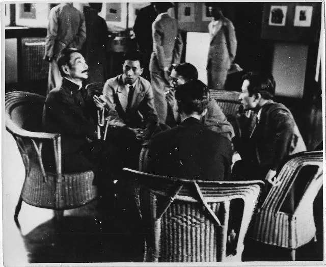 不僅如此,魯迅圖像中的場(chǎng)景也是為了更好地展現(xiàn)魯迅的權(quán)威地位而設(shè)計(jì)。在魯迅圖像中,描繪歷史事跡和特別場(chǎng)景的敘事性圖像更能引發(fā)想象,也更有內(nèi)涵空間。譬如黃永玉所作的《魯迅和木刻青年》(圖17),此畫(huà)將場(chǎng)景設(shè)計(jì)為左右對(duì)立,執(zhí)煙昂首正在講話魯迅居左,凝神靜聽(tīng)或坐或站的青年們居右。按照常理,這種左小右大不對(duì)稱(chēng)的場(chǎng)景設(shè)計(jì),重心自然在右,但這幅木刻中,畫(huà)面中心卻在左側(cè),即魯迅仍然是畫(huà)面核心。有兩方面的因素確保了魯迅的核心位置,一是青年們整齊劃一投向魯迅的目光,二是魯迅和青年們服飾上的黑白異色,使魯迅更為突出。實(shí)際上,黃永玉此作是有照片原型的,沙飛的這幅攝影(圖18)當(dāng)為其構(gòu)思底本。黃作中的魯迅形象簡(jiǎn)直完全脫胎于沙飛照片,所不同的是,黃作以藝術(shù)的手法重排了青年的空間位置,更加深刻、生動(dòng)地展現(xiàn)了魯迅的導(dǎo)師形象。