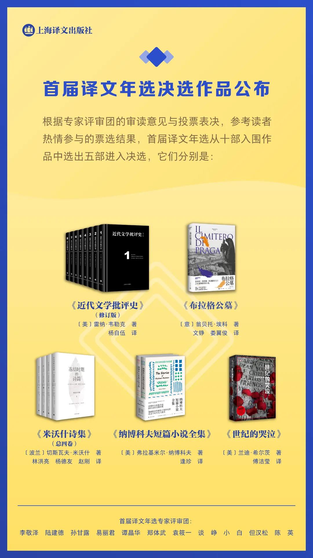 根據(jù)專家評審團(tuán)的審讀意見與投票表決,參考讀者熱情參與的票選結(jié)果,首屆“譯文年選”從10部入圍作品中選出5部進(jìn)入決選,它們分別是: