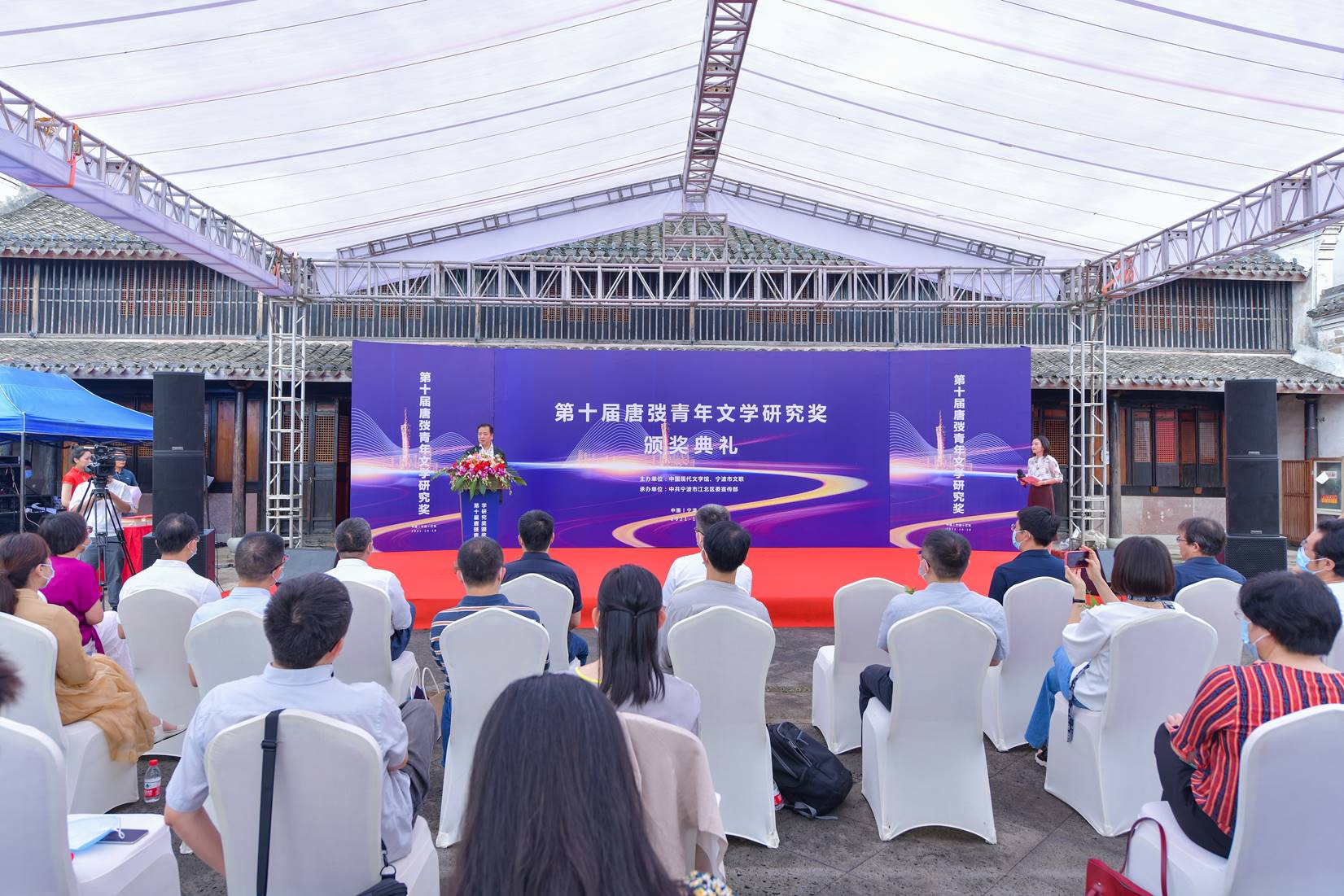 10月10日,由中國現(xiàn)代文學(xué)館、寧波市文聯(lián)主辦,中共寧波市江北區(qū)委宣傳部承辦的第十屆“唐弢青年文學(xué)研究獎”在寧波慈城舉辦盛大的頒獎典禮,這是該獎項自創(chuàng)辦以來首次在唐弢的故鄉(xiāng)寧波江北頒發(fā)。中國作家協(xié)會黨組成員、副主席、書記處書記李敬澤,寧波市文聯(lián)黨組書記、主席楊勁,寧波市江北區(qū)委常委、宣傳部長卜明長出席頒獎典禮并致辭。浙江省作協(xié)主席艾偉,中國現(xiàn)代文學(xué)館副館長梁飛、李洱,第十屆“唐弢青年文學(xué)研究獎”評委會成員、學(xué)者王鴻生、吳俊及寧波市和江北區(qū)的相關(guān)領(lǐng)導(dǎo)出席儀式并為獲獎?wù)哳C獎。