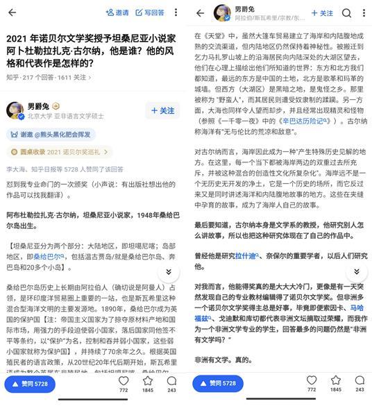 10月7日,坦桑尼亞小說家阿卜杜勒拉扎克·古爾納獲得2021年諾貝爾文學(xué)獎。該位作家此前并未出現(xiàn)在各類媒體、平臺的預(yù)測名單中,國內(nèi)可查閱到其作品的書籍更是稀少。然而冷門的獲獎?wù)卟⑽措y倒知乎,在諾貝爾文學(xué)獎公布當晚,大量網(wǎng)友涌入知乎,在“2021年諾貝爾文學(xué)獎授予坦桑尼亞小說家阿卜杜勒拉扎克·古爾納,他是誰?他的風格和代表作是怎樣的?”這一問題下尋求解答。