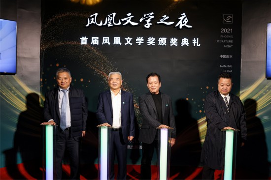 李敬澤(右二)、邱華棟(右)、梁勇(左二)、佘江濤(左)啟動(dòng)第二屆鳳凰文學(xué)獎(jiǎng)