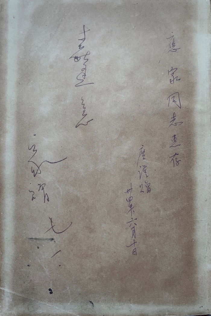 六年之后,陳庶將熟讀多遍并留下累累英文筆記的這冊(cè)書送給了應(yīng)家,其后7月1日應(yīng)家轉(zhuǎn)送嘉達(dá)。限于材料,暫未能考證出應(yīng)家的身份。嘉達(dá)在1945年8月28日赴東北前夕,將這本書送給了劉梓華。據(jù)此或可推斷嘉達(dá)應(yīng)為延安抗大的學(xué)員,由張秀山、林楓帶隊(duì)挺進(jìn)東北。而受贈(zèng)者劉梓華是位老紅軍,江西宜春人,1935年時(shí)是紅一軍團(tuán)二師四團(tuán)黃開湘、楊成武部的一名排長(zhǎng),飛奪瀘定橋22勇士之一,還參加過(guò)平型關(guān)戰(zhàn)役。1942年劉梓華入中央黨校學(xué)習(xí),之后曾任抗大七分校教育長(zhǎng)、教導(dǎo)一旅二團(tuán)參謀長(zhǎng)等職。他五次榮立戰(zhàn)功,九次重傷。1951年年僅39歲就因病去世。