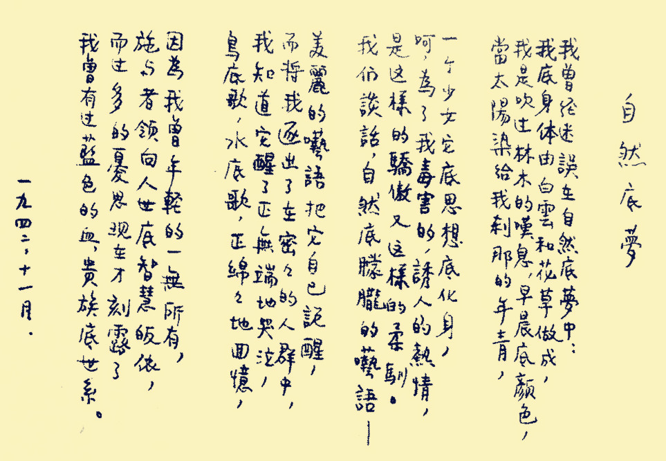 穆旦詩歌《自然底夢》手稿