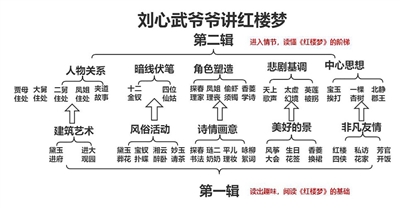 一是內(nèi)容由第一輯的“表”深入至第二輯的“里”。劉心武先生從《紅樓夢(mèng)》原著中巧妙地選取了一些要想讀懂《紅樓夢(mèng)》就必須弄懂的文本細(xì)節(jié)。這些故事與第一輯中呈現(xiàn)的故事完全不同,卻能夠在第一輯的故事的基礎(chǔ)上形成“拾級(jí)而上”的效果。我對(duì)兩輯的內(nèi)容進(jìn)行了詳細(xì)的邏輯梳理。