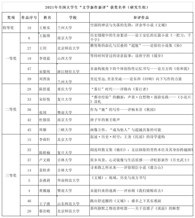 研究生組特等獎為王秋實的《空洞的神話與失落的先鋒:評余華小說》,認為《文城》試圖建構(gòu)一個現(xiàn)代的“烏托邦”神話,卻因過于虛置的主題意蘊與過于抽離的現(xiàn)實元素而沒有實現(xiàn)其意圖。文章蘊含批評的激情與鋒芒,分析扎實。