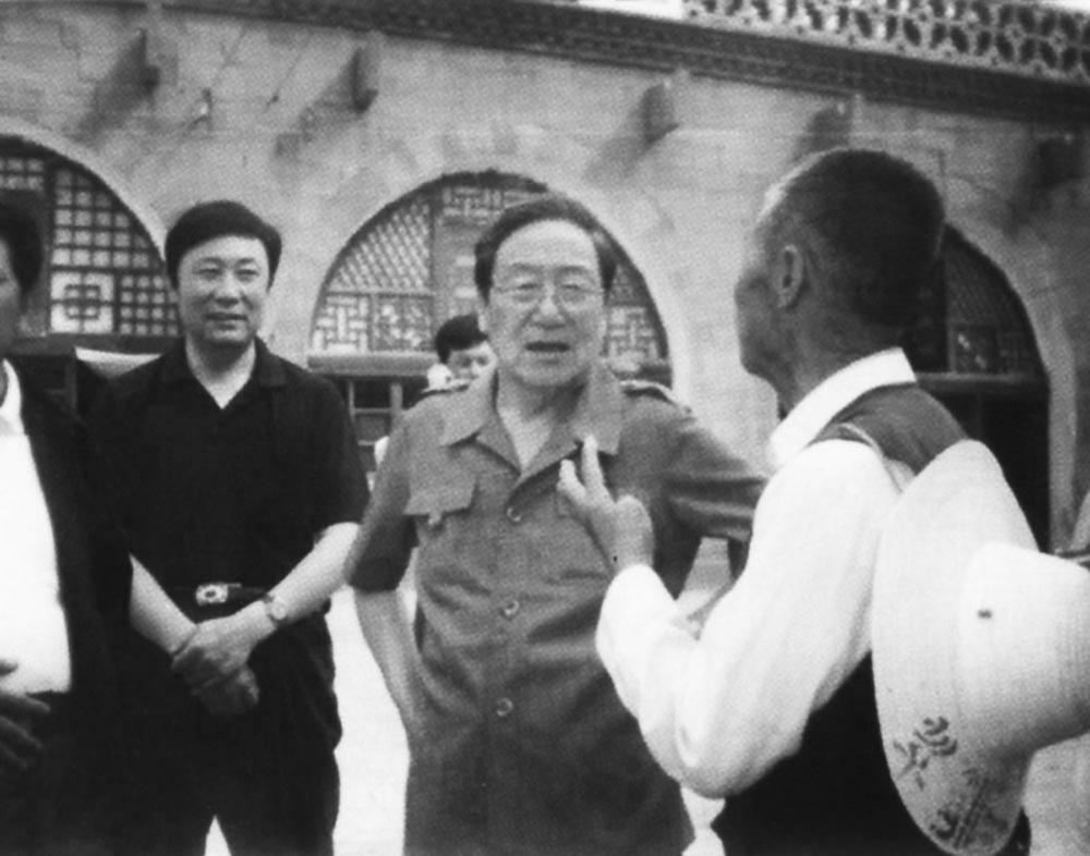 2001年5月,賀敬之在延安魯藝舊址與當(dāng)?shù)乩相l(xiāng)一起。