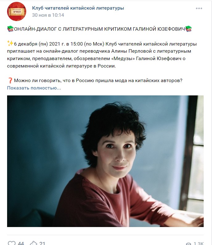 因疫情原因,上述兩場活動均在線上舉行,并通過俄羅斯社交平臺VK進行分享。每場活動均有六十多位觀眾線上參加,活動視頻觀看人數(shù)達四千多人次。俄羅斯“中國文學讀者俱樂部”將繼續(xù)發(fā)揮橋梁作用,加強與讀者的溝通對話,不斷向俄羅斯讀者介紹優(yōu)秀的中國文學作品,向俄羅斯人民講述當代中國的精彩故事。