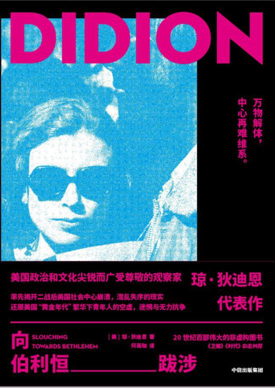 1956年,狄迪恩從加州大學(xué)伯克利分校畢業(yè),之后一直擔(dān)任《時(shí)尚》雜志的特寫編輯,直到1963年。1968年,34歲的狄迪恩出版非虛構(gòu)文集《向伯利恒跋涉》,可以說是她最為人稱道的作品,被《紐約時(shí)報(bào)》譽(yù)為“一部豐富的作品,呈現(xiàn)出美國(guó)當(dāng)下最出色的散文書寫”。“向伯利恒跋涉”取自葉芝名詩(shī)《第二次降臨》的結(jié)句,“然后是怎樣兇暴的巨獸,終于輪到了它的時(shí)日,/正疲沓地走向伯利恒去投生?”在《白色相冊(cè)》《薩爾瓦多》等報(bào)道文集中,記錄了美國(guó)社會(huì)、政治、文化等方面的現(xiàn)實(shí)狀況。1973年,湯姆·沃爾夫?qū)⒌业隙骷{入文集《新新聞主義》,同時(shí)收錄的還有杜魯門·卡波特、喬治·普林普頓、蓋伊·特立斯等人。