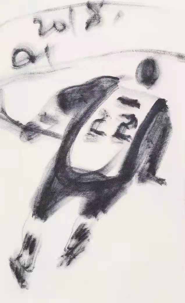 2000年以來,楊剛對(duì)著電視中的比賽場(chǎng)景創(chuàng)作了大量冬奧題材作品,用毛筆、馬克筆,或簽字筆、圓珠筆在各類紙上,畫下了千姿百態(tài)的速寫和水墨畫。他喜歡速寫的現(xiàn)場(chǎng)感,也強(qiáng)調(diào)線的趣味性,畫速寫成為他藝術(shù)人生的一大樂事。這些冬奧作品將速寫與書法用筆、意象造型相結(jié)合,融入現(xiàn)代抽象與構(gòu)成元素,藝術(shù)形象鮮活生動(dòng),所繪對(duì)象既有轉(zhuǎn)瞬即逝的臨場(chǎng)感與沖擊力,又有雕塑般的體量感和永恒性,在寥寥數(shù)筆中實(shí)現(xiàn)了“速度”與“力量”的矛盾統(tǒng)一,體現(xiàn)出生命的律動(dòng)和生生不息的奧運(yùn)精神。