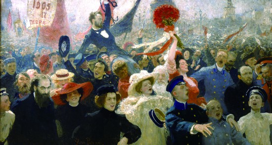 另一幅題為《1905年10月17日》的畫,表現(xiàn)一場俄國1905年民眾抗暴的革命場景,作者明言:“這里表現(xiàn)的是俄國社會解放”。畫上的師生和工人搖動紅旗歌唱,托舉一個“被赦免者”,歡呼他終獲自由。畫家這種渴望自由的情懷,于1903年在荷蘭灣海岸畫的《何等自由!》里已經(jīng)流露。那是一對男女青年在浪花中跳瑪祖卡舞,恰似一首青春的贊歌,在1905年革命潮流中愈顯熱情洋溢。這一現(xiàn)象表明,列賓雖然也為沙皇尼古拉二世和瓦爾瓦拉男爵夫人等顯貴畫過像,但他內心始終是同情俄羅斯廣大窮苦大眾,支持革命者反抗暴君的。