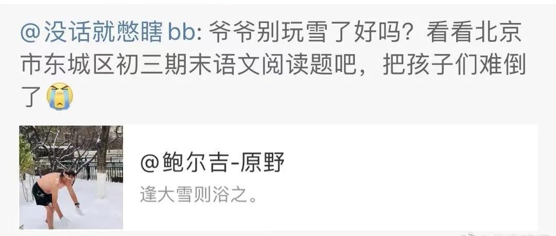近日,多地中小學(xué)的期末考試剛剛結(jié)束,作家鮑爾吉·原野收到了一則微博喊話:“爺爺北京東城區(qū)期末閱讀題,海蘭花妹妹心里想的是什么???”原來,作家鮑爾吉·原野的少年小說《烏蘭牧騎的孩子》節(jié)選內(nèi)容進(jìn)入了2022年1月北京東城區(qū)初三語文期末考試閱讀題,其中有一題要求補(bǔ)寫出文中海蘭花的內(nèi)心活動(dòng),該區(qū)的許多學(xué)生表示題目太難,紛紛去作家的微博留言求助,甚至有學(xué)生在作家多日前發(fā)的微博雪浴照下疾呼:“爺爺別玩雪了好么?看看北京東城區(qū)初三期末語文閱讀題吧,把孩子們難倒了?!?/p>