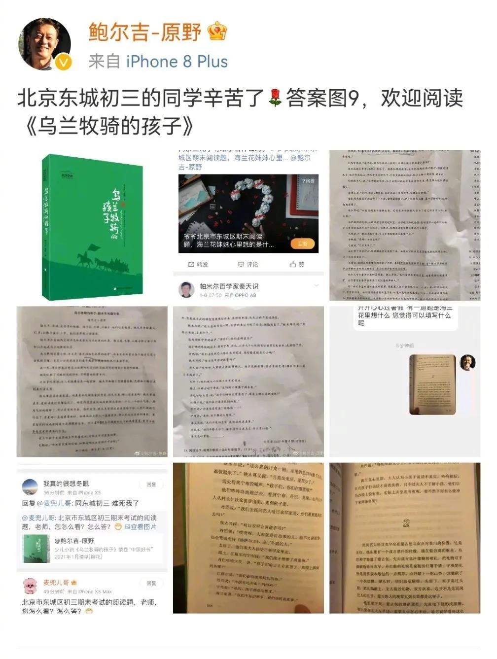 面對此種情境,作家本人熱情發(fā)微博回應(yīng),貼出閱讀題中所對應(yīng)的《烏蘭牧騎的孩子》原著內(nèi)容,為學(xué)生指點(diǎn)迷津。
