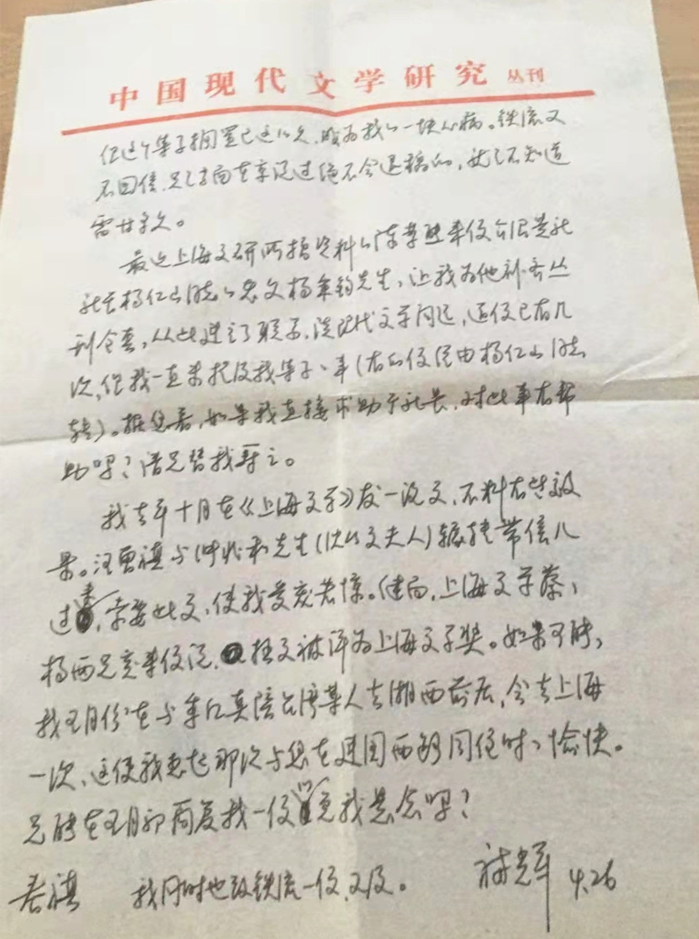 我去年十月在《上海文學(xué)》發(fā)一論文,不料有些效果。汪曾祺與張兆和先生(沈從文夫人)輾轉(zhuǎn)帶信兒過來,索要此文,使我受寵若驚。繼而,上海文學(xué)蔡、楊兩兄突來信說,拙文被評(píng)為上海文學(xué)獎(jiǎng)。如果可能,我五月份在與季紅真陪臺(tái)灣某人去湘西前后,會(huì)去上海一次,這便使我想起那次與您在建國(guó)西路同住時(shí)的愉快。兄能在五月初簡(jiǎn) 復(fù)我一信以免我懸念嗎?