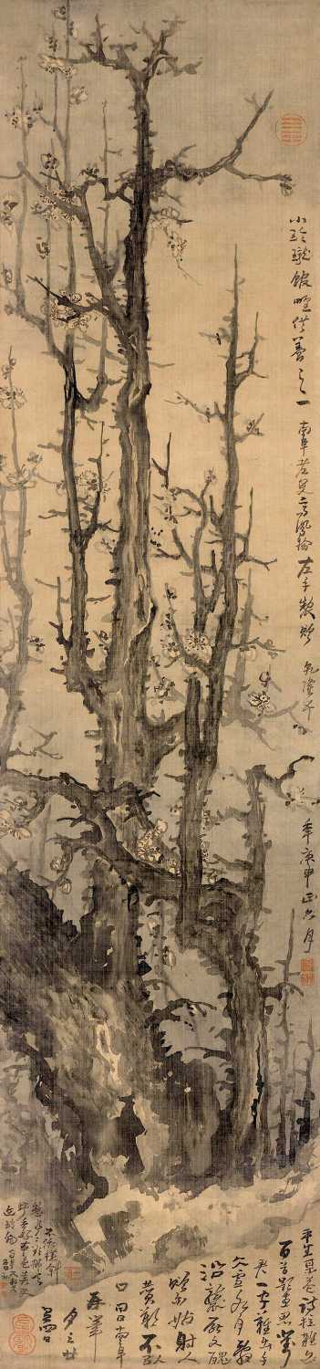 有專以梅花為主,如唐寅《墨梅圖》,純粹以墨筆為主,以枯筆焦墨畫梅花枝干,皴擦紋理,表現(xiàn)梅枝蒼勁虬曲的姿態(tài),以濃淡相間的水墨點(diǎn)畫花朵,以謹(jǐn)細(xì)之筆畫出花蕊。只見梅花風(fēng)姿綽約,清麗脫俗題詩灑脫清秀,筆法剛健清逸:“黃金布地梵王家,白玉成林臘后花。對(duì)酒不妨還弄墨,一枝清影寫橫斜?!?/span>
