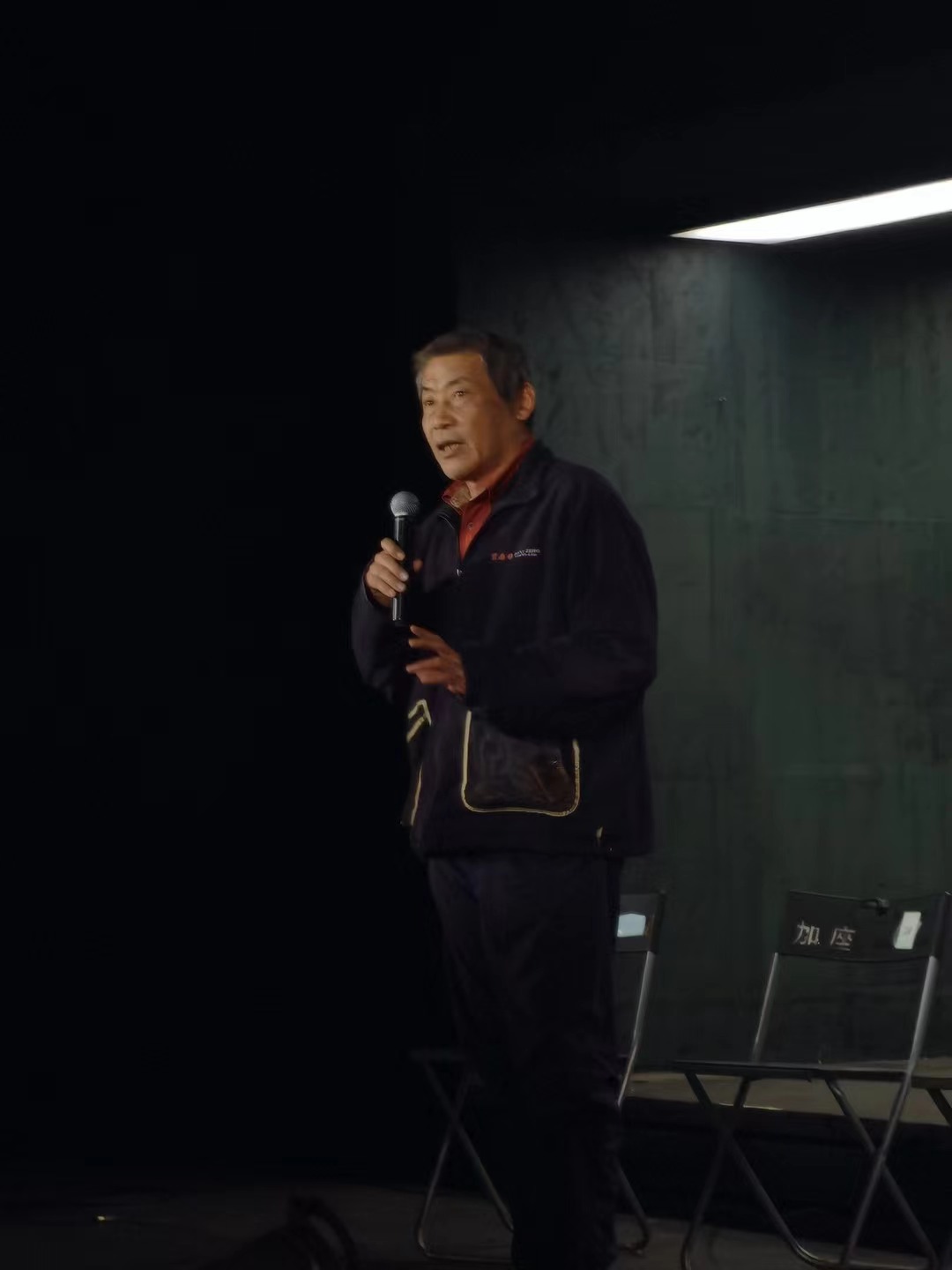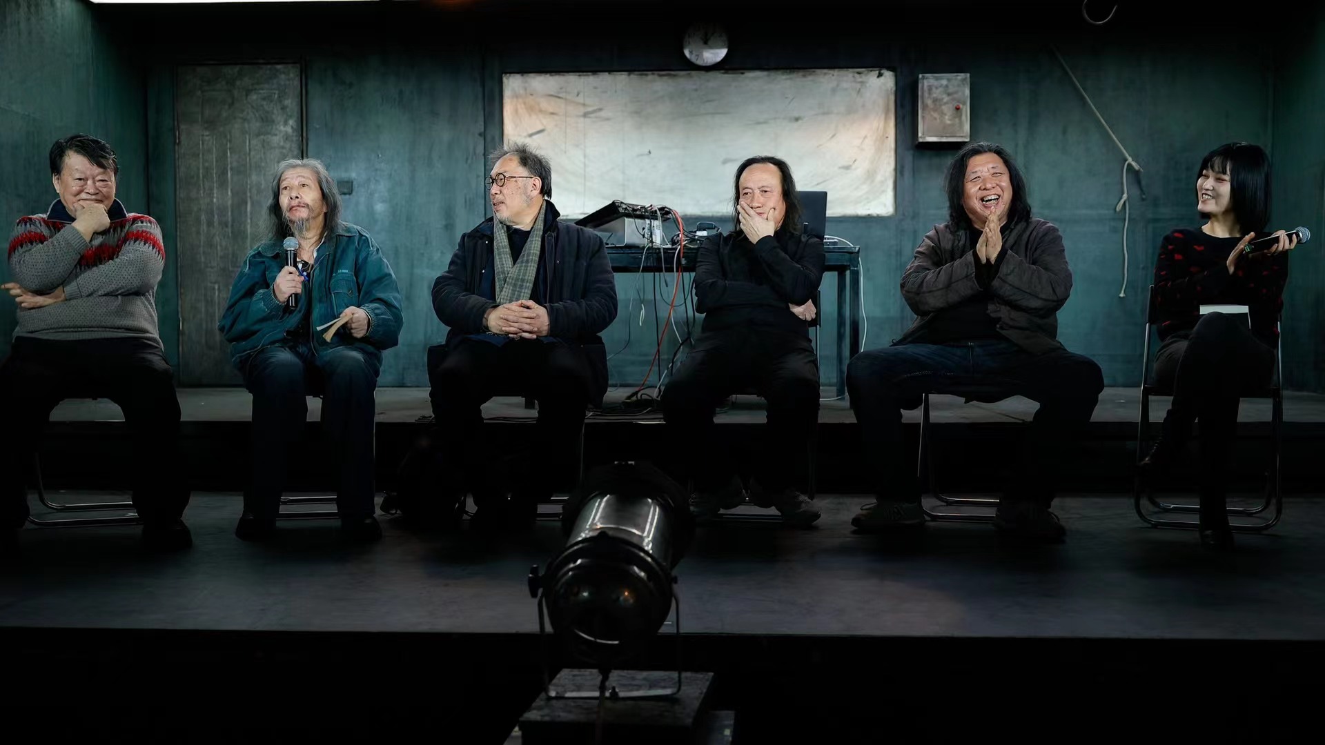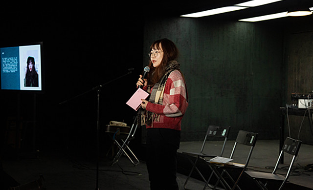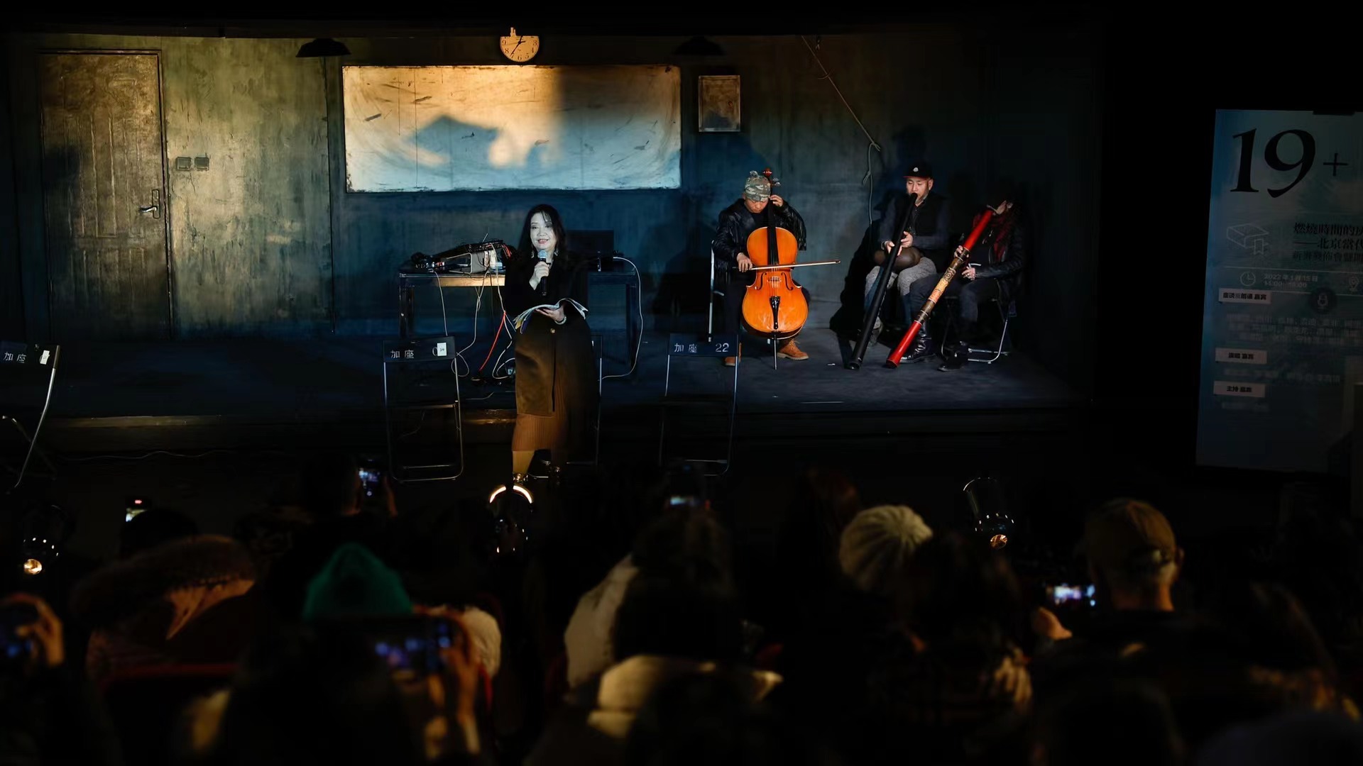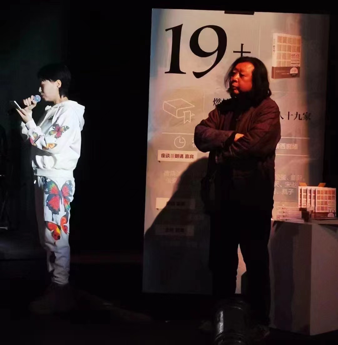 音樂人Gia Wang朗誦詩人宋逖作品時(shí),詩集編者老賀在臺(tái)側(cè)沉思