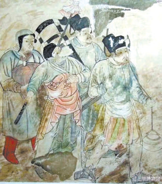 《歸來(lái)圖》,遼墓上的契丹壁畫。圖中四人,三人為漢族裝束,第四人髡發(fā),雙手抱包裹。此圖顯示了遼宋交融期間契丹人的漢化。