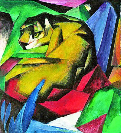 在西方古代美術(shù)作品中,獅、牛、羊、鴿、蛇等動物形象經(jīng)常出現(xiàn),但是我們卻幾乎看不到老虎的形象。造成這個現(xiàn)象的主要的原因是老虎的棲息地在以印度為中心的亞洲,亞歷山大遠征印度之前,西方鮮有人見過老虎。伴隨著數(shù)百年后東西方之間商貿(mào)、文化交流的增多,西方繪畫中才逐漸開始出現(xiàn)老虎的形象。17世紀,博洛尼亞美術(shù)學院創(chuàng)始人阿尼巴·卡拉奇為羅馬法爾內(nèi)塞宮創(chuàng)作的天頂壁畫《巴庫斯和阿里阿德涅的凱旋》,是最早繪制老虎形象的西方學院派美術(shù)作品。畫面中兩只虎在正前方拉車,虎的形象處理比較稚拙,體型較小,溫馴如狗。十九世紀后,浪漫主義代表畫家德拉克洛瓦創(chuàng)作了《嬉戲中的母虎與幼虎》,在這幅作品中,憑借德拉克洛瓦超強的造型能力,虎的勇猛之氣得以充分展示,兩只虎的形象幾乎占滿整個畫面,體態(tài)肥碩,四肢剛勁有力,細節(jié)處理的十分到位。德拉克洛瓦細膩的畫風、準確的造型已經(jīng)完全擺脫了早期歐洲畫家畫虎的稚拙之氣,其創(chuàng)作的一系列畫虎的作品在歐洲畫壇掀起了不小的波瀾。20世紀初,西方表現(xiàn)主義畫家弗朗茲·馬克筆下的老虎又呈現(xiàn)了新的變化。弗朗茲·馬克從1910年起專注于動物題材繪畫創(chuàng)作,他在動物身上發(fā)現(xiàn)了一種樸實純真、未被現(xiàn)代社會玷污的本質(zhì)美。弗朗茲·馬克認為藝術(shù)不應該停留在對事物外貌的摹寫,而應該揭示隱藏在紛繁復雜世界內(nèi)部的客觀精神實質(zhì)。用他自己的話來說,藝術(shù)應當表現(xiàn)“人們眼睛所見到的背后的東西,是抽象的精神?!痹谶@幅《虎》中,老虎形象的塑造沒有采用精細的描摹的方式,而是僅用幾何大塊面組合而成,虎的形象概括、整體、不失威嚴。