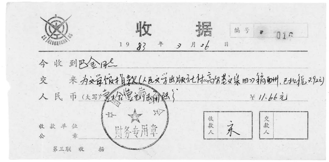3月21日 人民文學出版社《巴金選集》稿酬585.00元