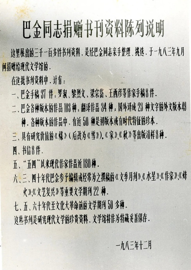 巴金捐贈書刊資料陳列說明