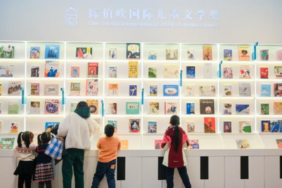 在展覽現(xiàn)場,觀眾們不僅可以欣賞到色彩斑斕的插畫,還能飽覽歷屆陳伯吹國際兒童文學(xué)獎獲獎作品。獲獎作品專架整體為鋼琴造型,一層層隔板仿佛一道道五線譜,獲獎圖書年份音符躍然于上,還不時流淌出曼妙的樂曲。其中,最新評選出的2021陳伯吹國際兒童文學(xué)獎的10部獲獎作品也是首度集體公開亮相。