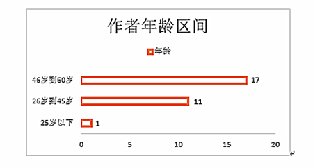 我們將年齡劃分為三個(gè)區(qū)間,可以看到作者的年齡跨度較大,年齡最小的尚在讀高中,一邊學(xué)習(xí),一邊寫(xiě)作,從事文學(xué)創(chuàng)作僅一年。年齡最大的創(chuàng)作至今已有20年。但這也還不是這群作者中創(chuàng)作年限最長(zhǎng)的,有人已經(jīng)有近40年創(chuàng)作歷史,所有作者中有大約三分之二創(chuàng)作年限都在10年以上,可以稱(chēng)得上是比較有經(jīng)驗(yàn)的寫(xiě)作者了。
