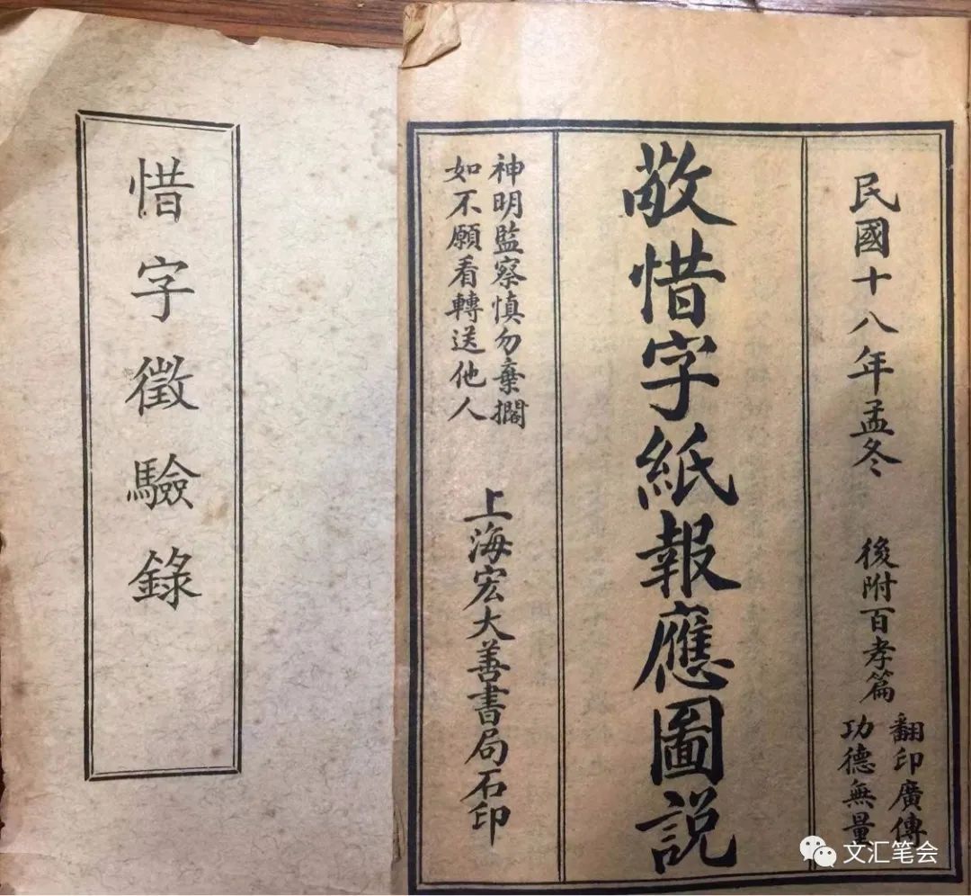 另一種包括兩本書:石印線裝的《惜字圖說》與石印本影印而成的《惜字征驗錄》(下圖),講的是明清以來極為流傳的“惜字”觀念,尤其印有字的“字紙”,張張都有靈,萬萬不可不敬,要不肯定出狀況,小則罹災(zāi)患病,大則家敗人亡。