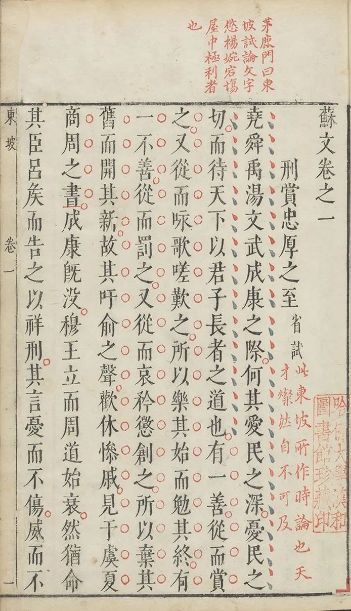 25 閔爾容輯評:《蘇文》卷首,明崇禎間烏程閔氏刻朱墨藍(lán)三色套印本。