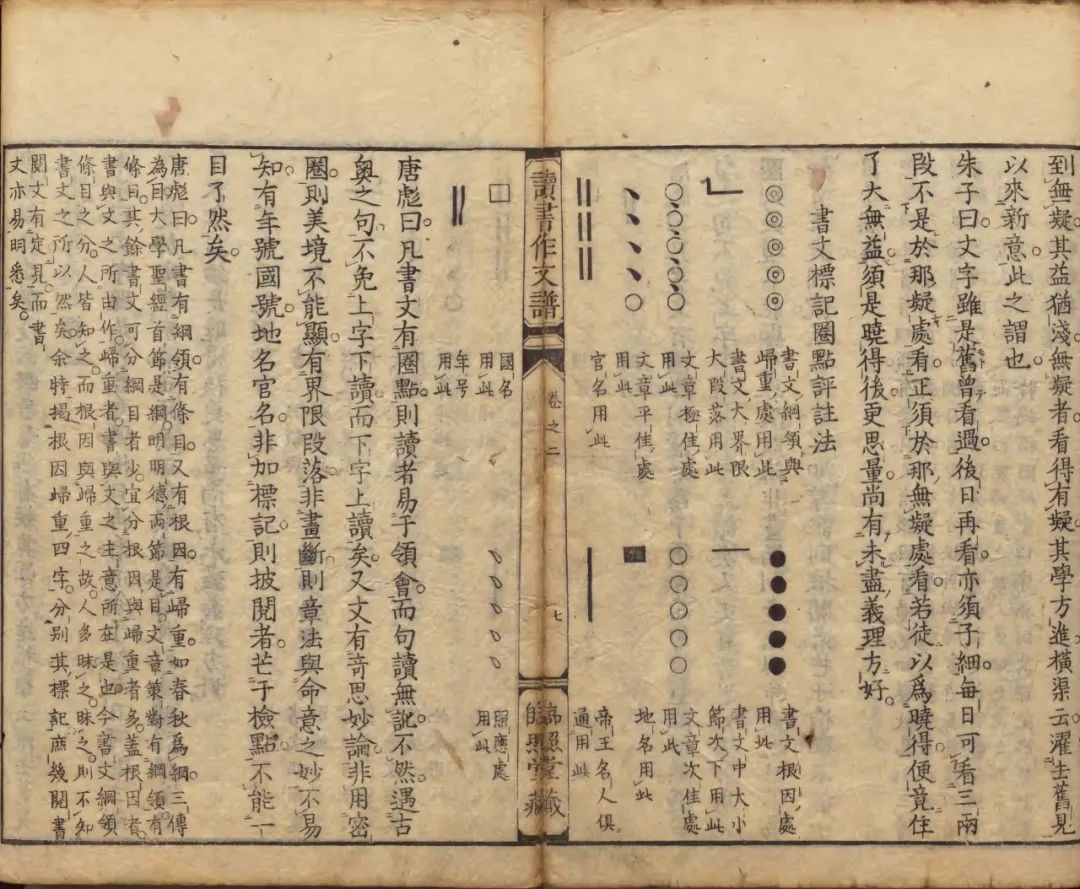 除了對聲音的關(guān)注,清人的閱讀理論對圈點(diǎn)運(yùn)用也作了更深入的分析,出現(xiàn)了如清初唐彪《讀書作文譜》一類細(xì)致論述讀書法的專書。該書列有《書文標(biāo)記圈點(diǎn)評注法》,指出“凡書文有圈點(diǎn),則讀者易于領(lǐng)會,而句讀無訛”43,將圈點(diǎn)之法融入到閱讀理論之中,既便于讀者斷句識文,也有助于領(lǐng)會文章精華和寫作技法。分析晚明至清初文論家有關(guān)書籍閱讀的相關(guān)論述,有助于我們從文字以外的符號、聲音等視角去考察古代的讀書及作文法。