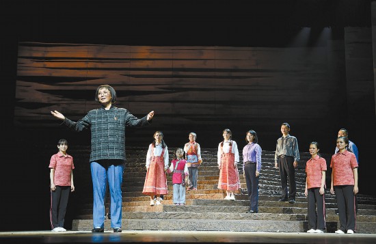 “同學(xué)們:我愛你們,我想你們,我等你們?!痹谘莩鲩_始和結(jié)尾,這幾句寫在黑板上的質(zhì)樸言語,道出了桂梅老師幾十年來對(duì)學(xué)生們最真摯的守候。12位演員分別扮演張桂梅的同事、學(xué)生,在舞臺(tái)上運(yùn)用宣講歌隊(duì)的形式完成場與場的空間切換,在講述桂梅老師故事的時(shí)候則有往事重演、時(shí)光穿越式的展示。她免費(fèi)擔(dān)任華坪兒童福利院院長,成為百余名孤兒的“媽媽”;她頂著重重壓力,克服種種困難創(chuàng)辦了免費(fèi)女子高中;她在昆明街頭為創(chuàng)辦學(xué)校募資,風(fēng)餐露宿四處奔波;為了把錢留給孩子們,她穿著破洞褲子參加黨代會(huì)引起記者關(guān)注;她身上幾十種病痛,甚至曾鬼門關(guān)走一遭,也擋不住她拯救山里孩子的決心,她對(duì)孩子們的愛,溫柔且堅(jiān)定,只為守候心中那片熱土。演出中,不少觀眾沉浸在桂梅老師的動(dòng)人事跡中,潸然淚下。