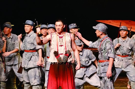 二、探索紅色基因的浪漫表達(dá)。近年來作為舶來品的音樂劇在貼近時(shí)代、貼近都市年輕人生活、實(shí)現(xiàn)本土化轉(zhuǎn)化和探索市場(chǎng)化運(yùn)營(yíng)方面都有了可喜收獲。在慶祝建黨百年的主題創(chuàng)作中,《壯士》的主創(chuàng)團(tuán)隊(duì)在廓清、抓準(zhǔn)了平山老兵們的歷史壯舉和精神譜系之后,針對(duì)音樂劇藝術(shù)特點(diǎn)及藝術(shù)表現(xiàn)需要設(shè)定人物性格,結(jié)構(gòu)故事框架,鋪排戲劇主線,提煉深化主題,確定了該劇浪漫史詩(shī)的呈現(xiàn)風(fēng)格。全劇集中筆墨營(yíng)造各種典型戰(zhàn)爭(zhēng)環(huán)境、戰(zhàn)斗場(chǎng)面和慘烈犧牲的氛圍,在主、次表演區(qū)均突出表現(xiàn)了平山子弟兵告別故土、悲壯出征,奮勇殺敵、無畏犧牲,南泥灣大生產(chǎn)、學(xué)習(xí)文化、政治培訓(xùn),南征北返,告別延安平山籍烈士碑,迎戰(zhàn)祁連山風(fēng)雪,憧憬新中國(guó)誕生等一系列戲劇化場(chǎng)景,塑造了主人公“平山”從一個(gè)農(nóng)民士兵,身經(jīng)百戰(zhàn),浴火成長(zhǎng)為八路軍連長(zhǎng),為掩護(hù)戰(zhàn)友阻擊日寇壯烈殉國(guó)的英雄典型。劇中“通訊員”接過平山連長(zhǎng)的嗩吶,也成為連長(zhǎng)率領(lǐng)戰(zhàn)士繼續(xù)征戰(zhàn),彰顯了“平山老兵精神”的巨大感召力。女兵“教員”作為與平山一起離家出征的“女壯士”,不僅用個(gè)人的情感之愛呵護(hù)著平山這個(gè)同鄉(xiāng)英雄,還用學(xué)文化、悟思想的革命博大之愛,讓平山壯士們從內(nèi)心明白為誰而戰(zhàn),為誰犧牲的革命道理。