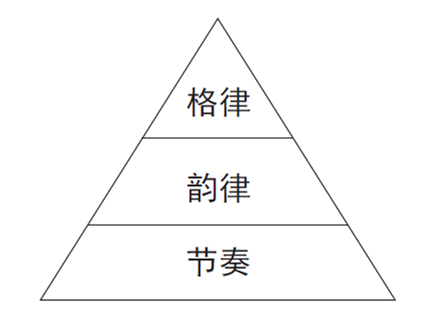 在區(qū)分了“格律”與“節(jié)奏”外延上的廣狹區(qū)別之后,就有必要再討論一下它們在內(nèi)涵上有何區(qū)別與聯(lián)系,并思考“格律”與“節(jié)奏”之間的互動(dòng)在歷史中是如何展開的,即“格律”是如何在“節(jié)奏”的基礎(chǔ)上一步步產(chǎn)生的;而到了現(xiàn)代,為何又被很多語種的詩歌(包括漢語)普遍地廢棄的。關(guān)于這個(gè)問題,帕斯有精到的觀察:“格律源自節(jié)奏,也會返回到節(jié)奏。最初,兩者的界限是模糊不清的。爾后,格律凝結(jié)成固定的模式。這既是它光輝的時(shí)代,也是它僵化的末世。當(dāng)韻文脫離了語言的漲潮與落潮,就蛻變成了聲響度量。和諧之后,便是僵化……”42可以進(jìn)一步說,如果說韻律是種種詩歌聲音的規(guī)律性和原則的總稱話,那么格律則是這些原則中的一部分在詩歌史中凝結(jié)成的固定的、約定性的體系,因此也是歷史性的,相對的;而非格律的韻律則是寫作中自發(fā)形成的不固定的原則與方法。正是在這一意義上,T. S. 艾略特?cái)嘌裕骸耙粋€(gè)韻律學(xué)(prosody)體系不過是一系列相互影響的詩人的節(jié)奏所具有的共同點(diǎn)的程式化(formulation)而已?!彼赋觯骸白杂稍娛菍┧赖男问降姆磁?,也是對新形式的到來和舊形式的更新所作的準(zhǔn)備?!?3從這些認(rèn)識出發(fā),我們可以將“節(jié)奏”“韻律”“格律”三者的關(guān)系以一個(gè)金字塔圖示: