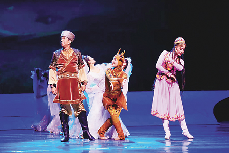 主創(chuàng)團(tuán)隊(duì)融合了音、舞、詩(shī)、畫等藝術(shù)形式鍛造的美麗場(chǎng)面及戲劇化表演的敘事情景,恰到好處地使用了古代詩(shī)歌中常見(jiàn)的“比興”技巧,潤(rùn)物無(wú)聲地表現(xiàn)新疆人民對(duì)愛(ài)情、幸福生活、真善美的追求。“比”指比喻,其使用對(duì)人或物有更加形象的比喻,使其含義更加深刻,個(gè)性主旨鮮明突出?!芭d”指起興,借助其他事物作為情感發(fā)端,引起所要歌詠的內(nèi)容。該劇中第一篇章《美麗的傳說(shuō)》中傳說(shuō)的小鹿是“比”,象征美好純真的愛(ài)情。第二篇章順“勢(shì)”而為,有了“比”基礎(chǔ)的鋪墊之后,《心靈的呼喚》呼之欲出,呼喚的是忠貞純潔的愛(ài)情。人們對(duì)美好愛(ài)情的無(wú)比向往和追求。