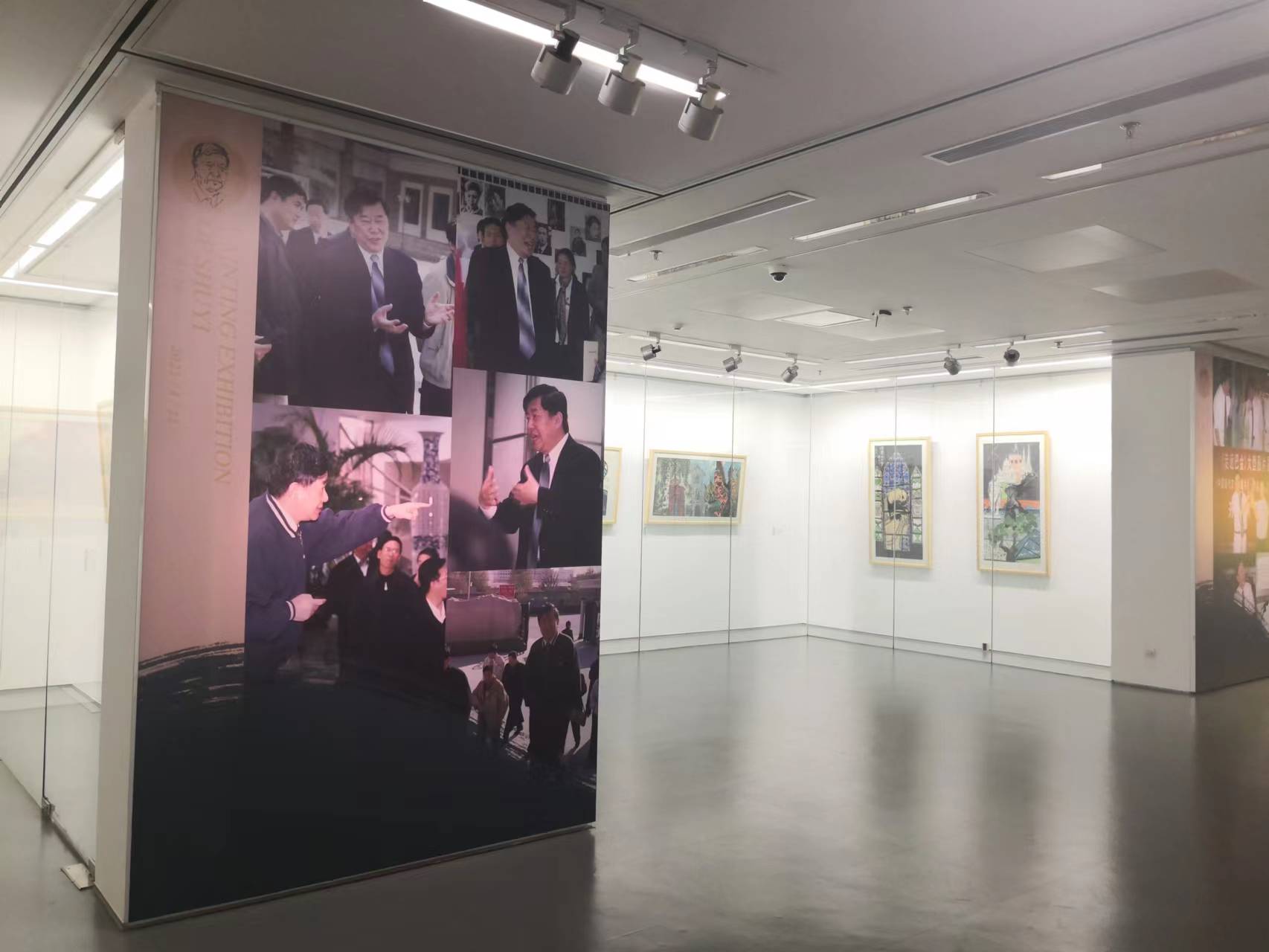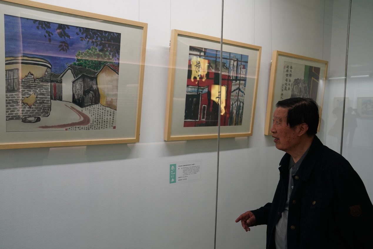 展廳一角。舒乙先生畫作與他在文學(xué)館工作期間的工作照交替排列。